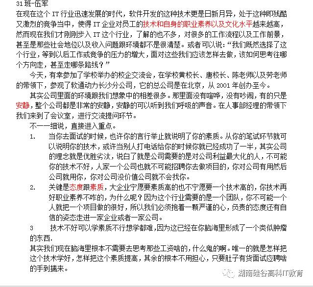 A:我们主要看中的是专业技能和综合素质,专业技能的高低直接决定了我们能够给到的薪酬的不同,在工作中,其实衡量你的就是你能够为公司带来的价值;综合素质方面主要体现在待人接物之类的,我们给你打第一个电话的时候对你的考核就已经开始了,还有你的沟通能力和表达能力和团队合作精神,IT行业是很注重团队合作的,从我个人招聘经验来看,招聘过程是很残酷的,我们在做招聘过程中第一看的是你的简历,你的简历不好我们就直接PASS掉了,也不会深入了解到你的其它,所以建议同学们在应聘时简历一定要写好能够体现出你自己的优势等。